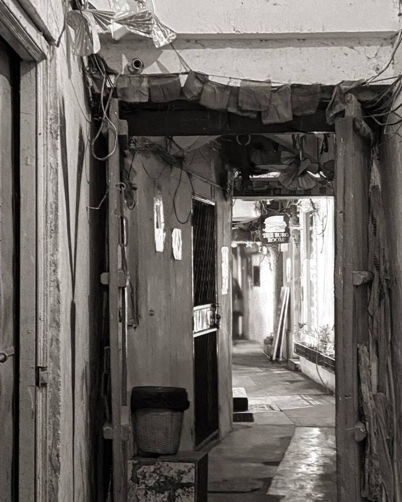 वह लकड़ी के टूटे बेंच पर बैठी है